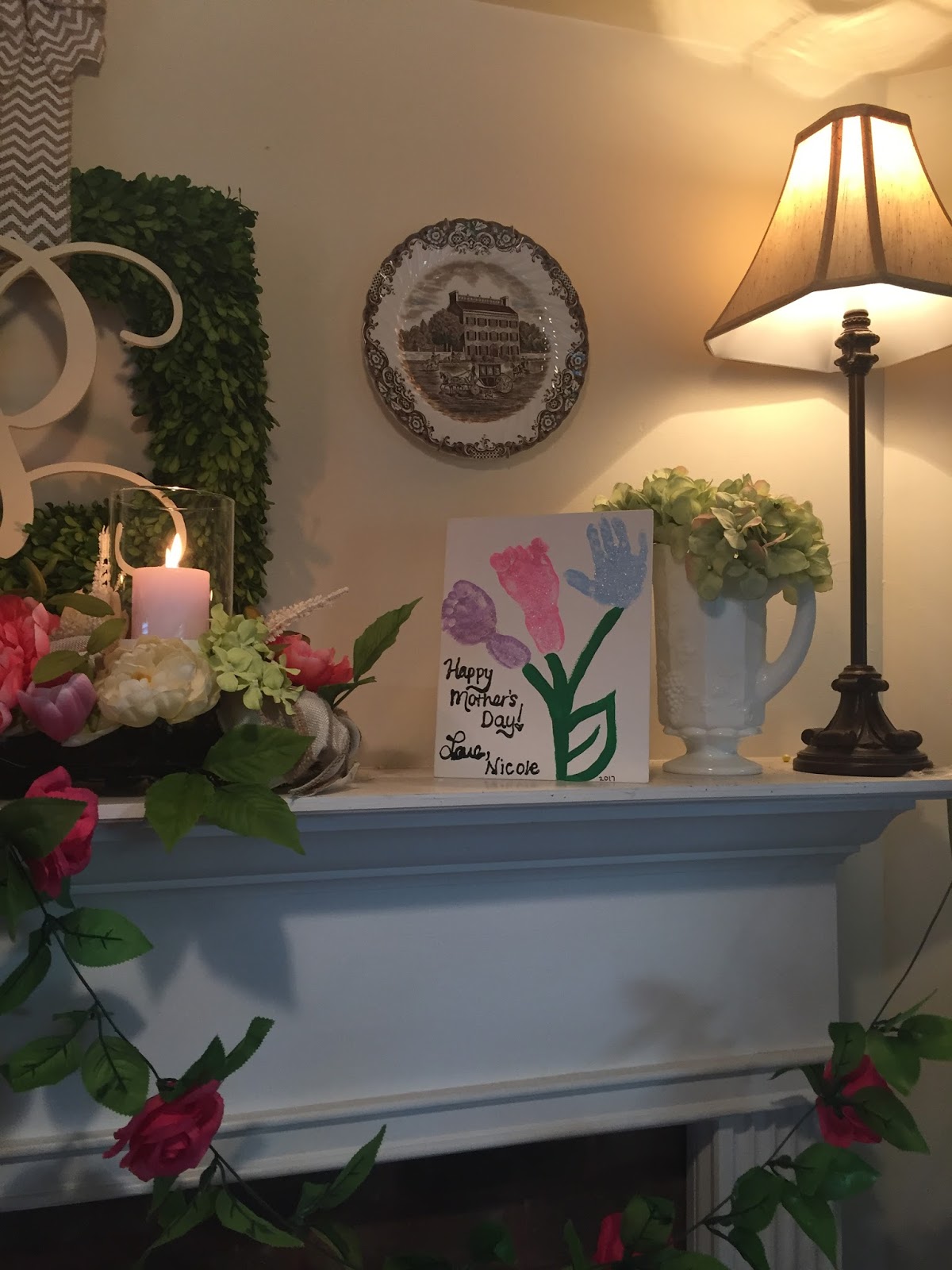 When I think of May, I think of lots of pretty flowers and Mother's Day!! Today I wanted to share with you our May mantle!